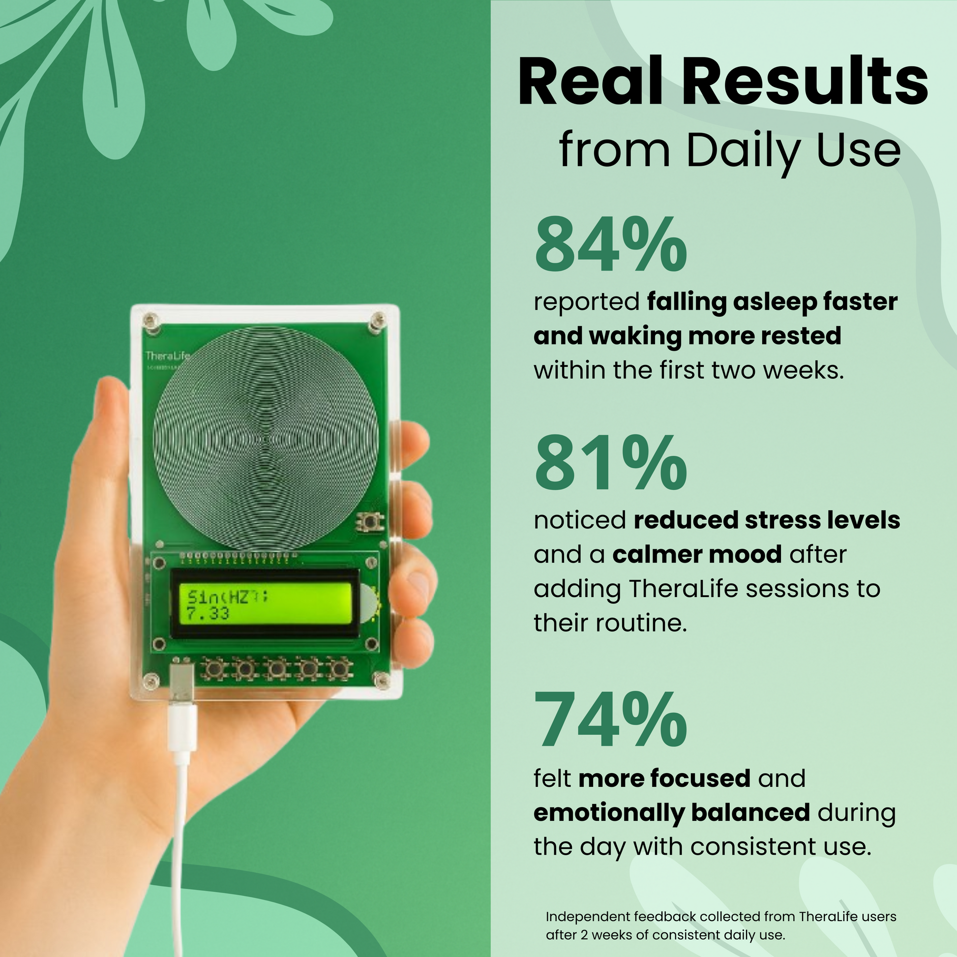 The TheraLife Frequency Generator™ resets your brain’s natural rhythm with pure therapeutic frequencies, helping you fall asleep faster, calm stress and anxiety, and restore lasting balance. Discover the difference between temporary relief and true reset!